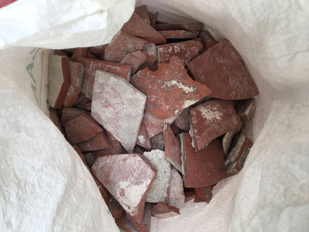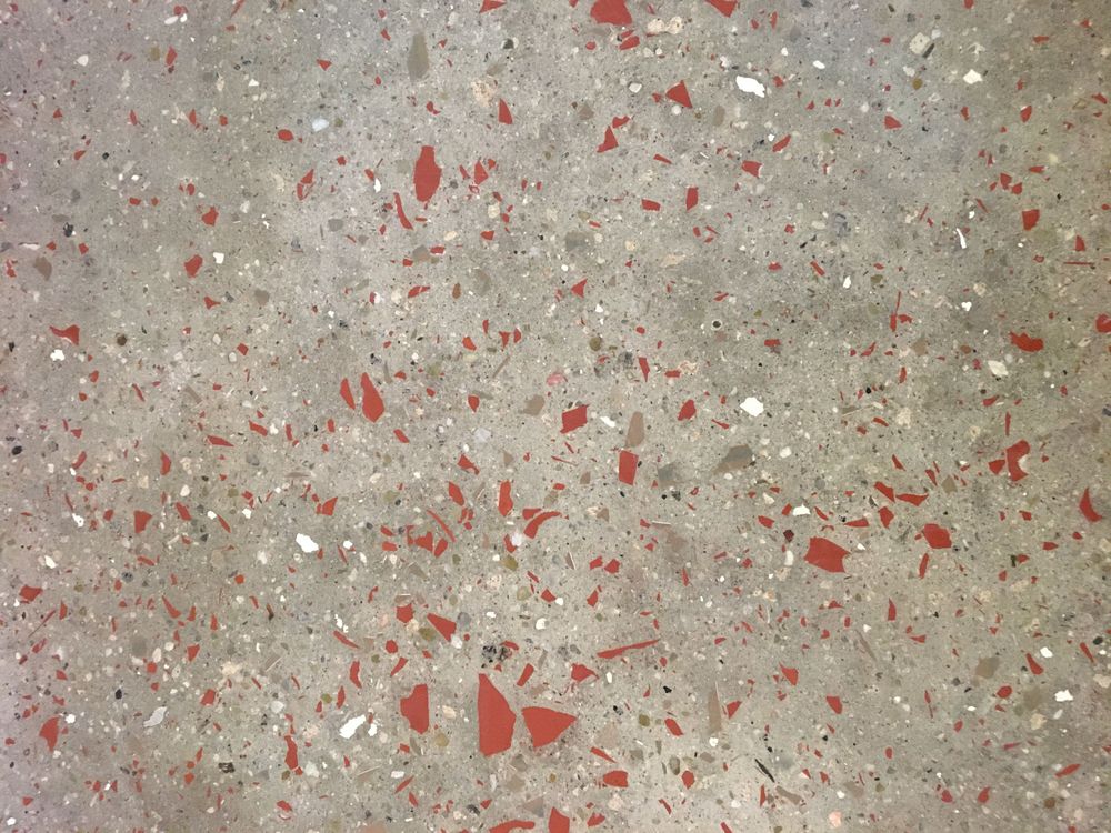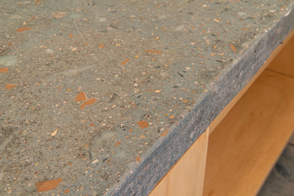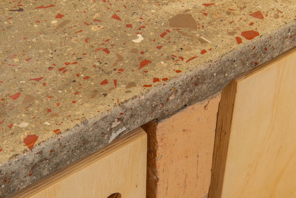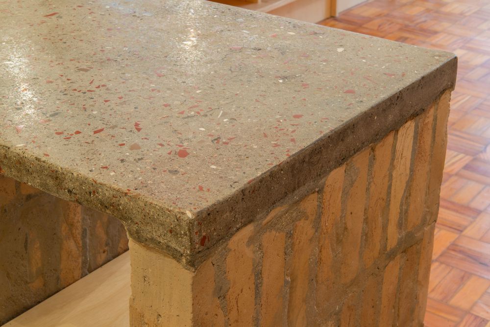 The "entulhite" was developed by RUÍNA through experimentation with the reuse of demolition waste on construction sites. The name is a result of a pun on the words "granilite" (terrazzo) - a well-known coating composed of a cementitious base mixed with granules of natural stones such as marble, granite, quartz, and other materials - and "entulho" (debris) crushed to form the aggregate base of the entulhite.